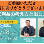 急な募集にも関わらず、たくさんの方に参加いただきました! 本当にありがとうございました!! 4月28日開催の「利益の考え方と出し方」オンラインコラボセミナー 参加いただいた方の感想を紹介しますね^^ &nb […]